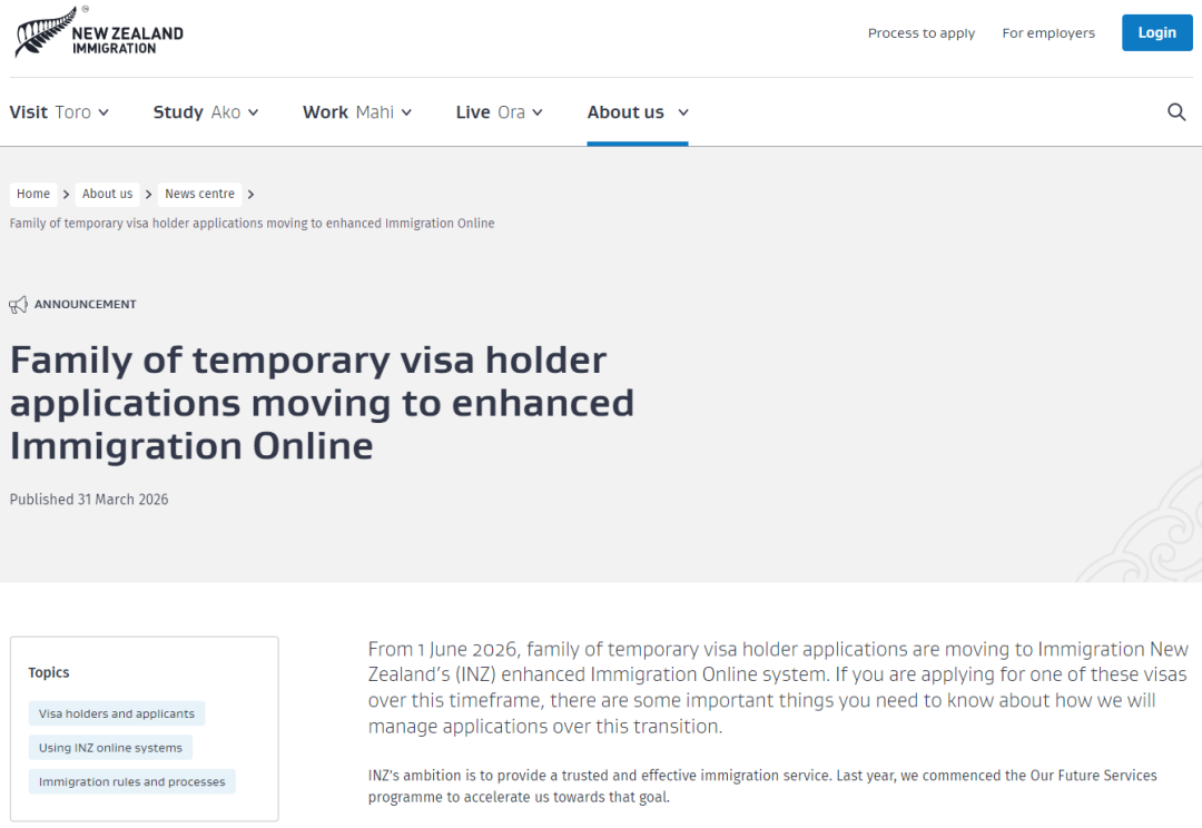 自2026年6月1日起,新西兰“临时签证持有人的家庭成员”类签证申请将迁移至全新的、增强版“移民在线”系统。