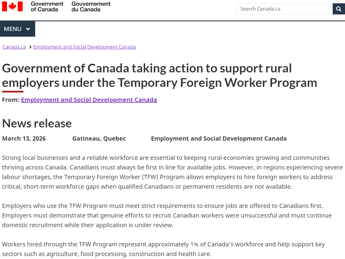 加拿大政府3月13日宣布了一项临时外国劳工(TFW)政策,自2026年4月1日起,符合条件的农村企业将被允许雇佣更多低薪外籍员工。