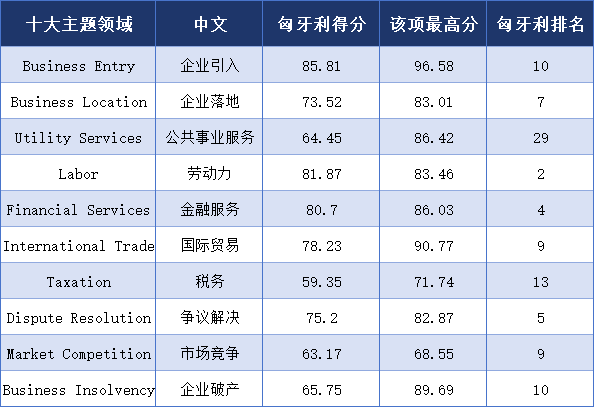 匈牙利在十大主题领域中,有八个领域进入前十,尤其在劳动力、金融服务和争议解决领域表现优异,分别排名第2位、第4位和第5位。