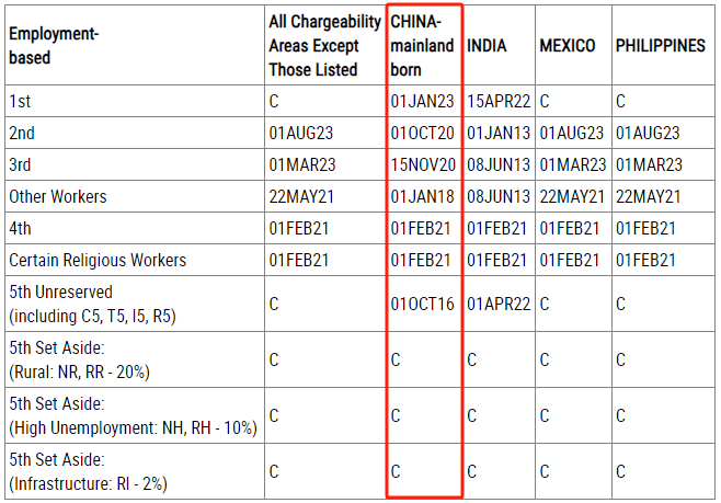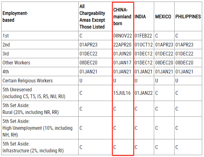 根据最新排期表,中国大陆出生申请人职业移民表A(Final Action Date):