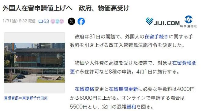 据称,此次涨价是由于物价和人工费上涨所采取的措施,涨价对象包括在留资格变更和永住许可等8种申请。