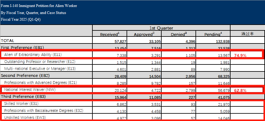 · EB-1A 共收到移民申请 7,338 份,审批通过了3,291 份,拒签 1,105份,等待审理 13,567 份,获批率 74.9%