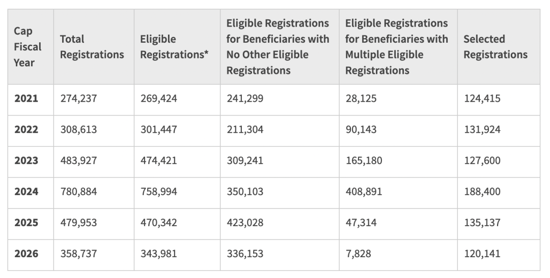 近日,美国移民局(USCIS)公布了2026财年(即2025年3月注册)H-1B的注册和首轮抽签数据: