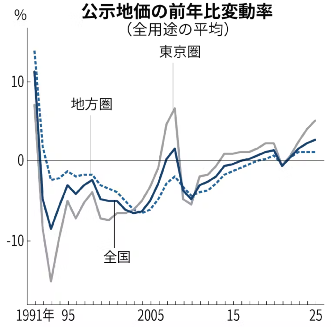 日本国土交通省于2025年3月18日发布的公示地价显示,全国所有用途平均地价同比攀升2.7%,实现连续四年增长。该涨幅较2024年2.3%的增幅持续扩大,创下自1992年泡沫经济崩溃以来的zui高纪录。
