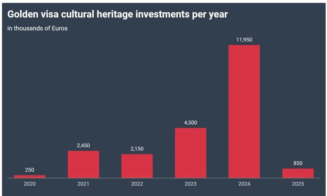 葡萄牙黄金签证文化遗产选项各年度投资额