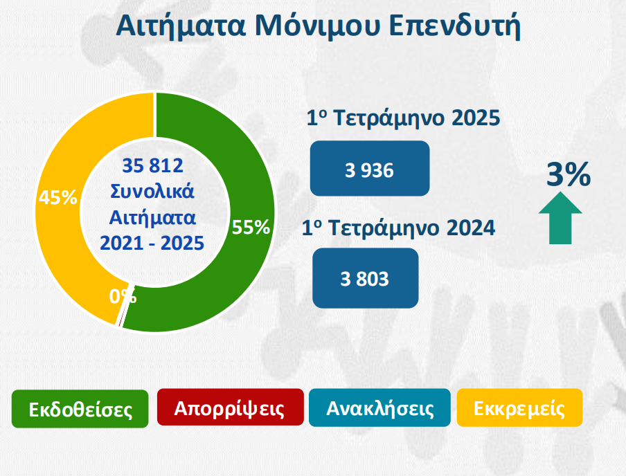 近日,希腊移民局公布了截至2025年4月的黄金签证数据情况:希腊投资者居留许可申请量比去年同期上涨3%,永居卡签发量上涨44%。