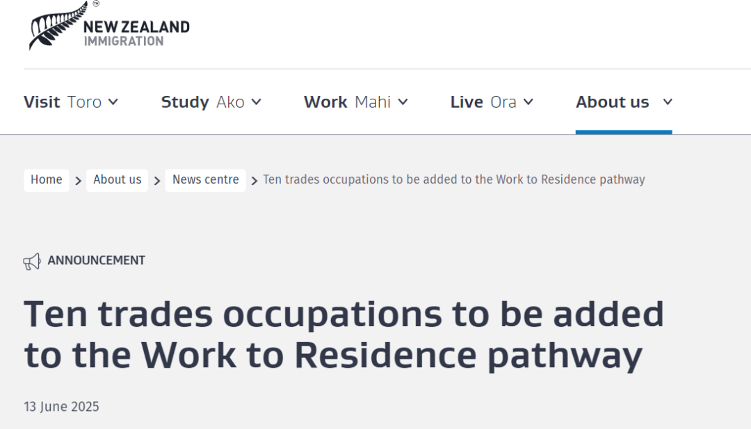6月13日,新西兰移民局官宣:2025年8月,10个技术工种将被纳入“绿色清单”(Green List)中的“工作转居留”通道(Work to Residence)!
