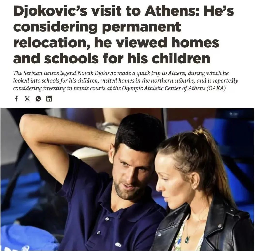 据希腊媒体Proto Thema报道,世界网坛传奇巨星诺瓦克·德约科维奇将于今年9月移居希腊首都雅典。上周德约科维奇突然现身雅典北郊基菲夏地区,并被拍到参观当地学校,疑似为子女择校。