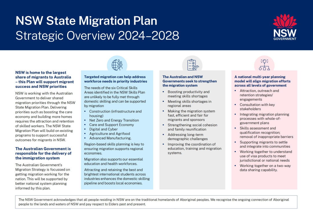新南威尔士州(NSW)是澳洲接收移民zui多的州,而《新州移民战略概览(2024–2028)》正是为了支持移民成功定居,同时服务于新州的经济与社会优先事项。