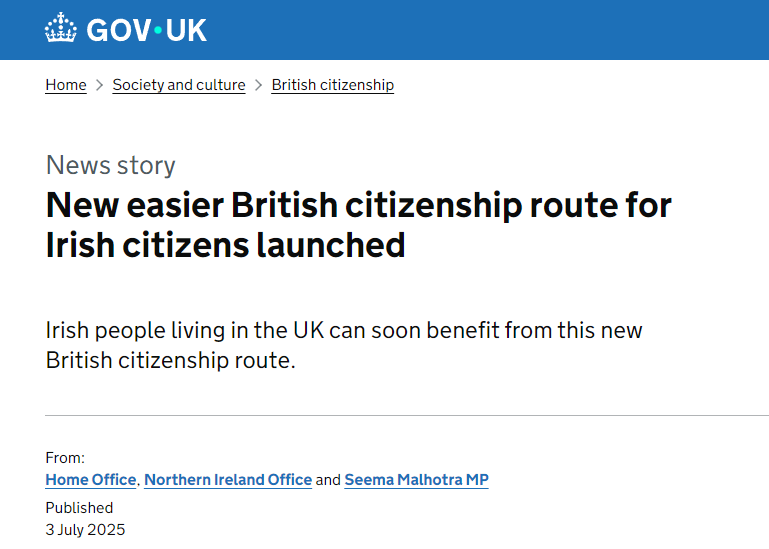 7月3日,英国政府正式宣布:针对爱尔兰公民的“简化入籍通道”将于2025年7月22日正式生效。根据《2024年英国国籍(爱尔兰公民)法案》,符合条件的爱尔兰公民将享受免试入籍、费用减半等重大利好。