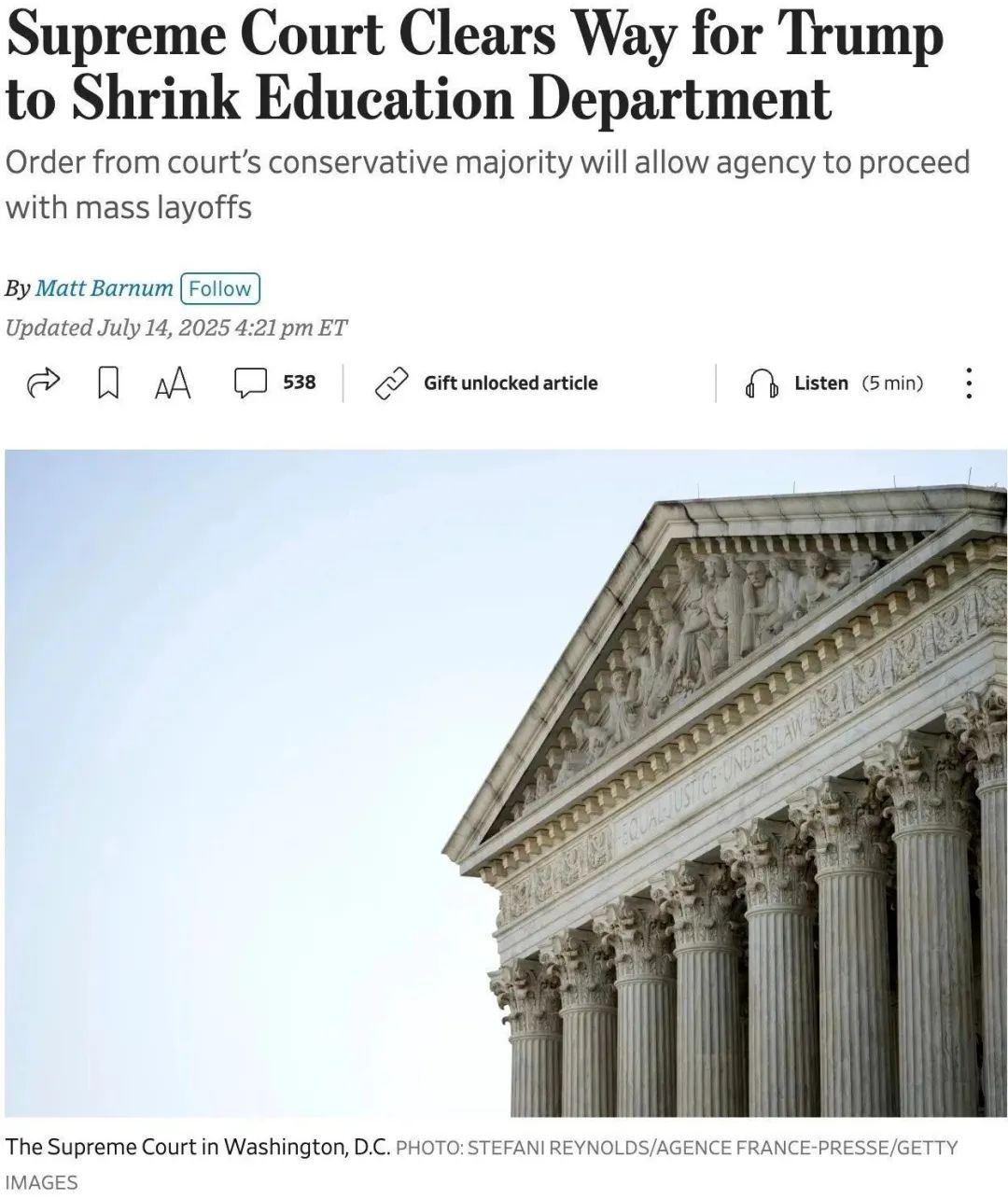 7月14日,美国zui高法院裁定,允许特朗普政府对联邦教育部进行大规模裁员。这标志着特朗普第二任期内针对教育系统进行的“瘦身”改革取得关键性进展。