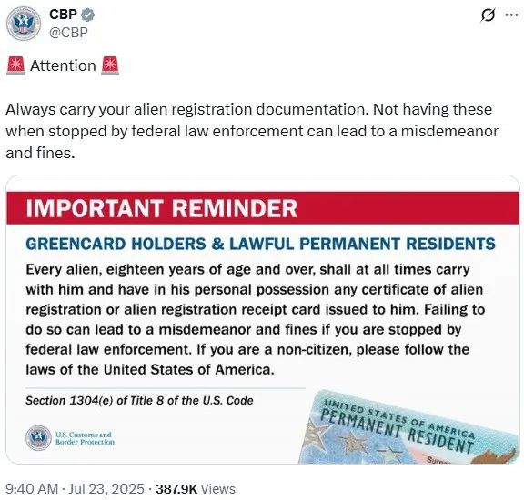 7月23日,美国海关与边境保护局(CBP)在其社交媒体X平台上发布了一则公告,再次强调了所有合法居留的外籍人士,尤其是绿卡持有者,在日常生活中随身携带移民身份证明文件的法律义务。该公告引起了不少在美华人的关注,也引发了不少人对于日常身份管理与执法环境变化的讨论。