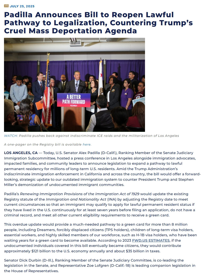 7月25日,加州联邦参议员亚历克斯·帕迪拉(Alex Padilla)在洛杉矶召开新闻发布会,宣布正在起拟一项立法,允许在美国居住至少七年、已经纳税、对社区有贡献、没有犯罪记录的无证客更容易成为合法的yongjiu居民。