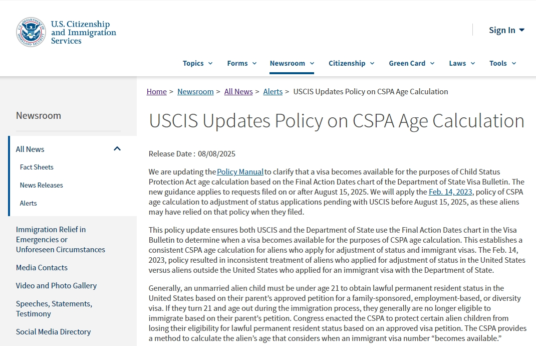 8月8日,美国公民及移民服务局(USCIS)发布公告,正式修订《政策手册》(Policy Manual)中《儿童身份保护法》(CSPA)的年龄计算规则。自2025年8月15日起,CSPA年龄将仅依据国务院签证公告中的“最终行动日期”(Final Action Dates,即表A)计算,不再参考此前相对宽松的“申请提交日期”(Dates for Filing,即表B)。