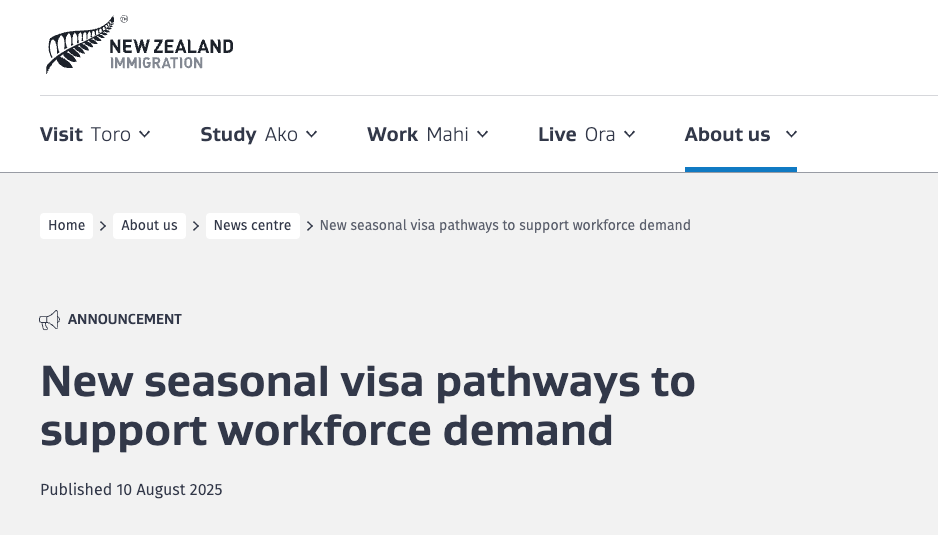 这两种新的季节性工签通道将于2025年12月8日开放申请,纳入现行的“认证雇主工作签证”(AEWV)体系,并与“认可季节性雇主计划”(RSE)并行实施。