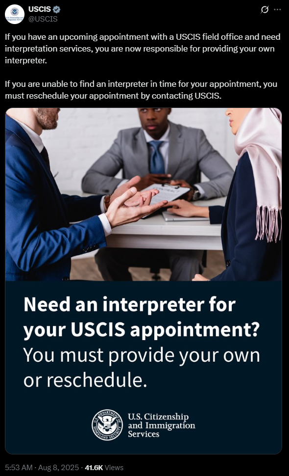 根据USCIS在社交平台X上发布的公告,所有预约在USCIS现场办公室进行面谈、但无法流利使用英语沟通的申请人,必须自行携带符合要求的合格口译员。USCIS将不再提供官方翻译服务。