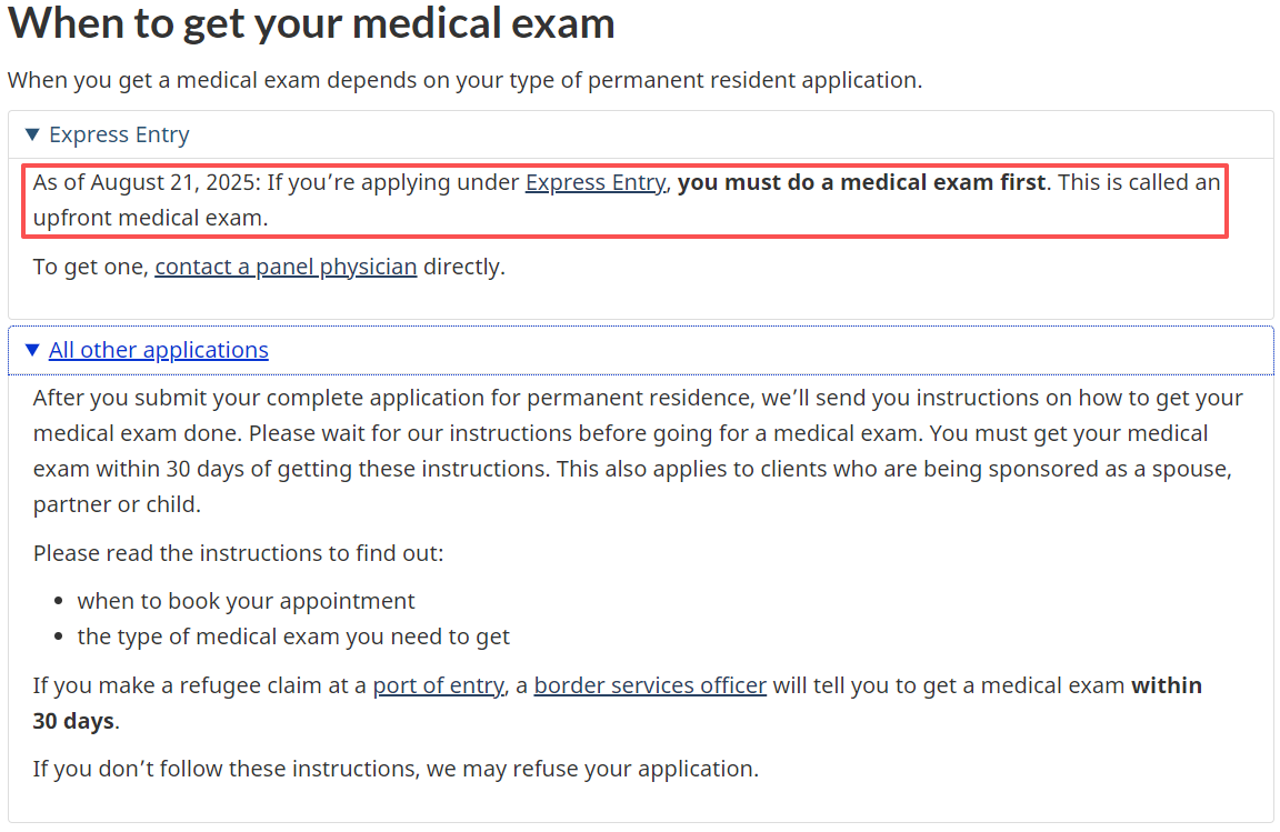 近日,加拿大移民、难民和公民部(IRCC)宣布,从2025年8月21日起,所有通过快速通道(Express Entry,简称EE)申请永久居民的人士,必须在递交申请前完成预先体检(Upfront Medical Exam)。未按要求完成体检者,申请将无法进入处理阶段。