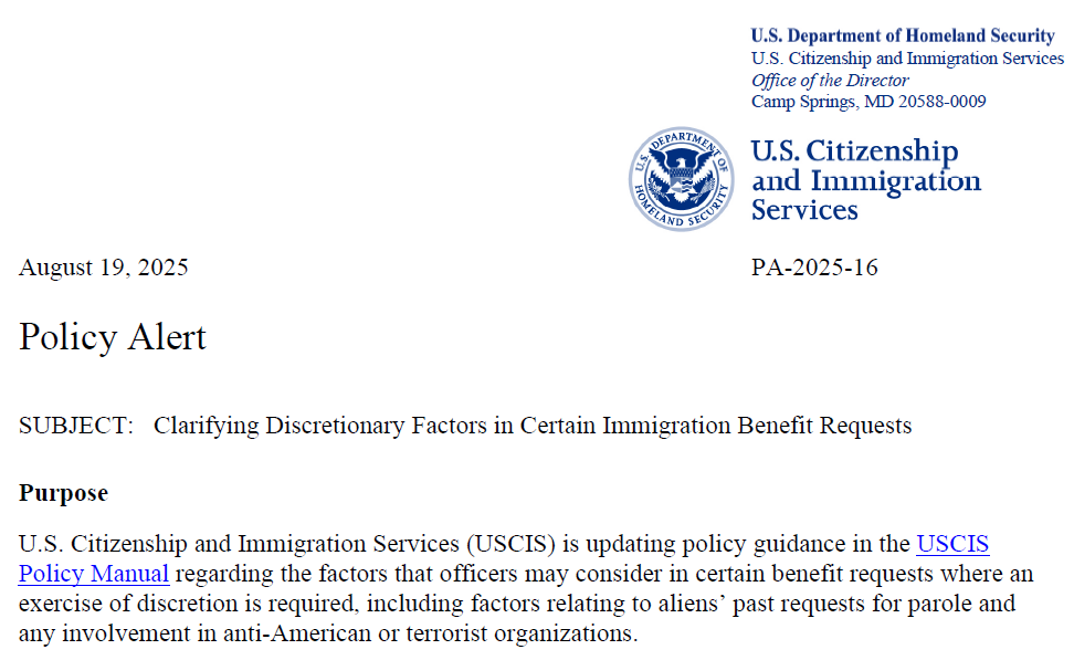 2025年8月19日,美国公民及移民服务局(USCIS)发布了一份新的政策警示,对涉及移民审案官“自由裁量权”的移民申请给出了更明确、更严格的指导,甚至明确将反美主义和反犹太主义列为移民申请中的“压倒性负面因素”。这意味着移民案件的获批难度更大了。