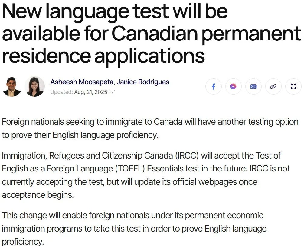 加拿大移民部(IRCC)8月21日宣布重磅新政:正式认可托福精要版考试(TOEFL Essentials)作为经济类永久移民项目的指定英语考试!这一突破性决策为全球申请者开辟了一条全新的语言测试通道。