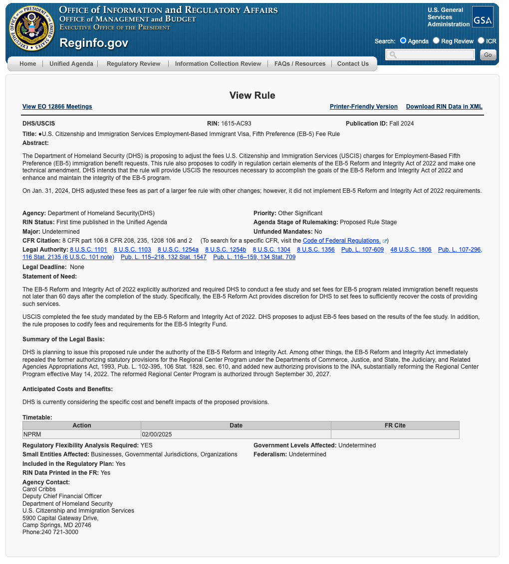 8月11日,美国行政管理和预算局(OMB)官网更新关键动态: 美国公民及移民服务局(USCIS)基于就业的第五类优先移民签证(EB-5)费用规则” (RIN 1615-AC93) 状态已更新为 “Pending Review”(待审查)。