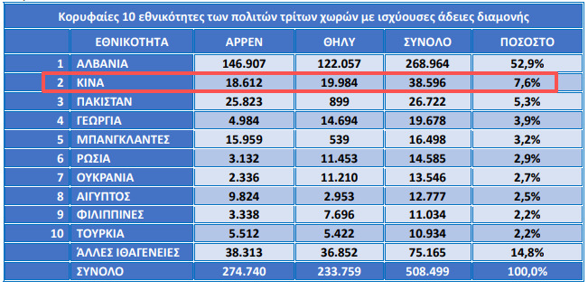目前,持有希腊有效居留许可的中国籍公民共有38,596人。其中男性有18,612人,女性有19,984人,占在希腊的第三国公民的7.6%。