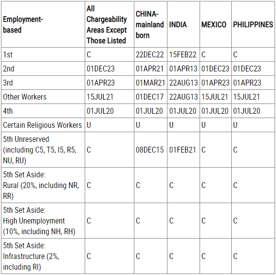 根据最新排期表,中国大陆出生申请人职业移民表A (Final Action Date):