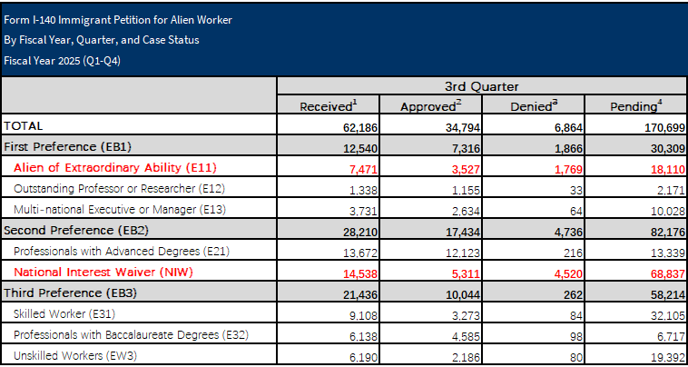 近日,美国移民局(USCIS)公布了2025财年第三季度(2025年4月至6月)的I-140职业移民申请审核数据。