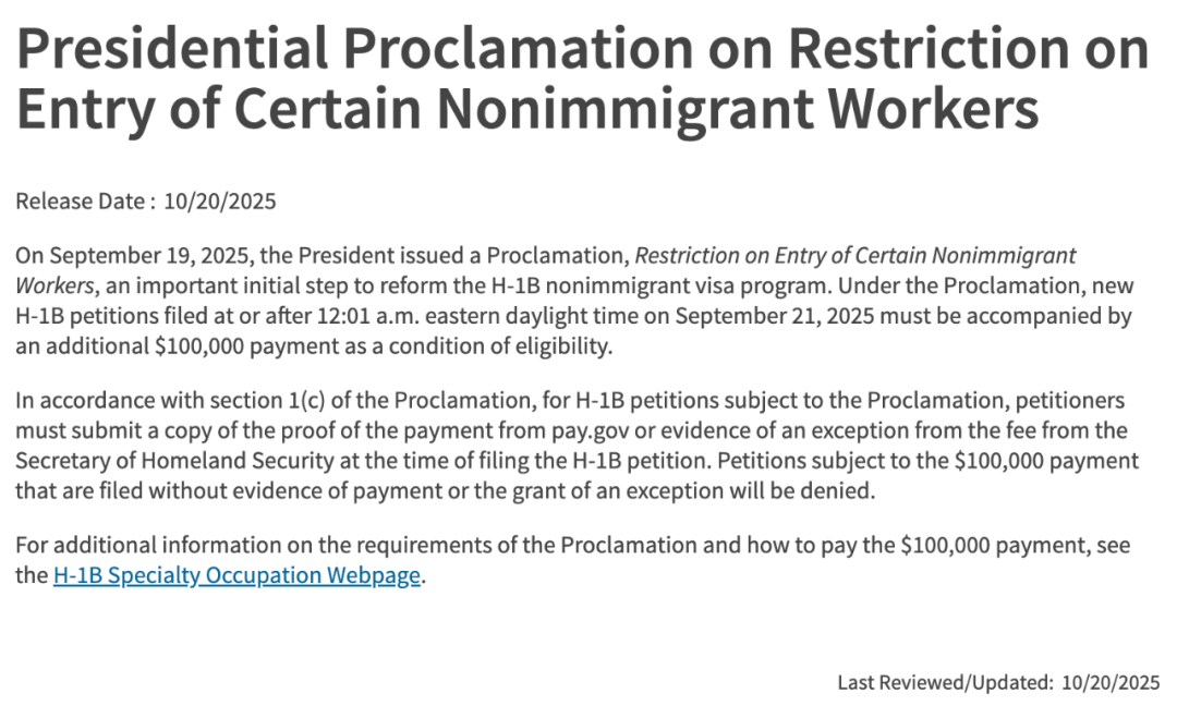 2025年10月20日,美国移民局(USCIS)发布正式指南,对“H-1B的10万美金新政”进行了重要更新。为H-1B申请与美国雇主划出了一条清晰的界线: