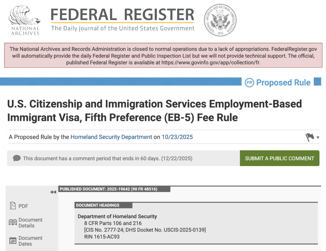 10月23日,美国国土安全部(DHS)在《联邦公报》(Federal Register)正式发布了EB-5投资移民项目收费拟议规则(Proposed Rule),并进入为期60天的公众意见征集期。这是继《2022年EB-5改革与诚信法案》之后的一次全面制度更新。