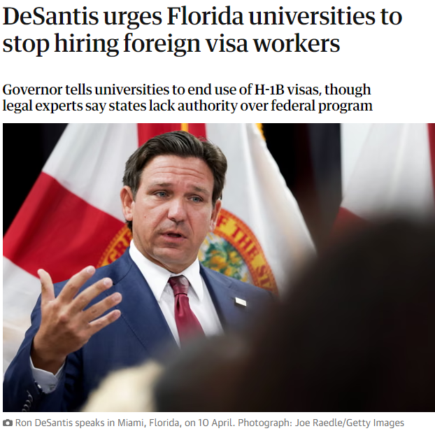 据美国媒体10月29日报道,美国佛罗里达州州长罗恩·德桑蒂斯(Ron DeSantis) 周二指示该州高等教育管理委员会(Board of Governors),全面禁止州立大学雇用外籍专业技术人员,也就是H-1B签证持有者,理由是学校“雇用外国劳工,而不是有资格的美国人”。