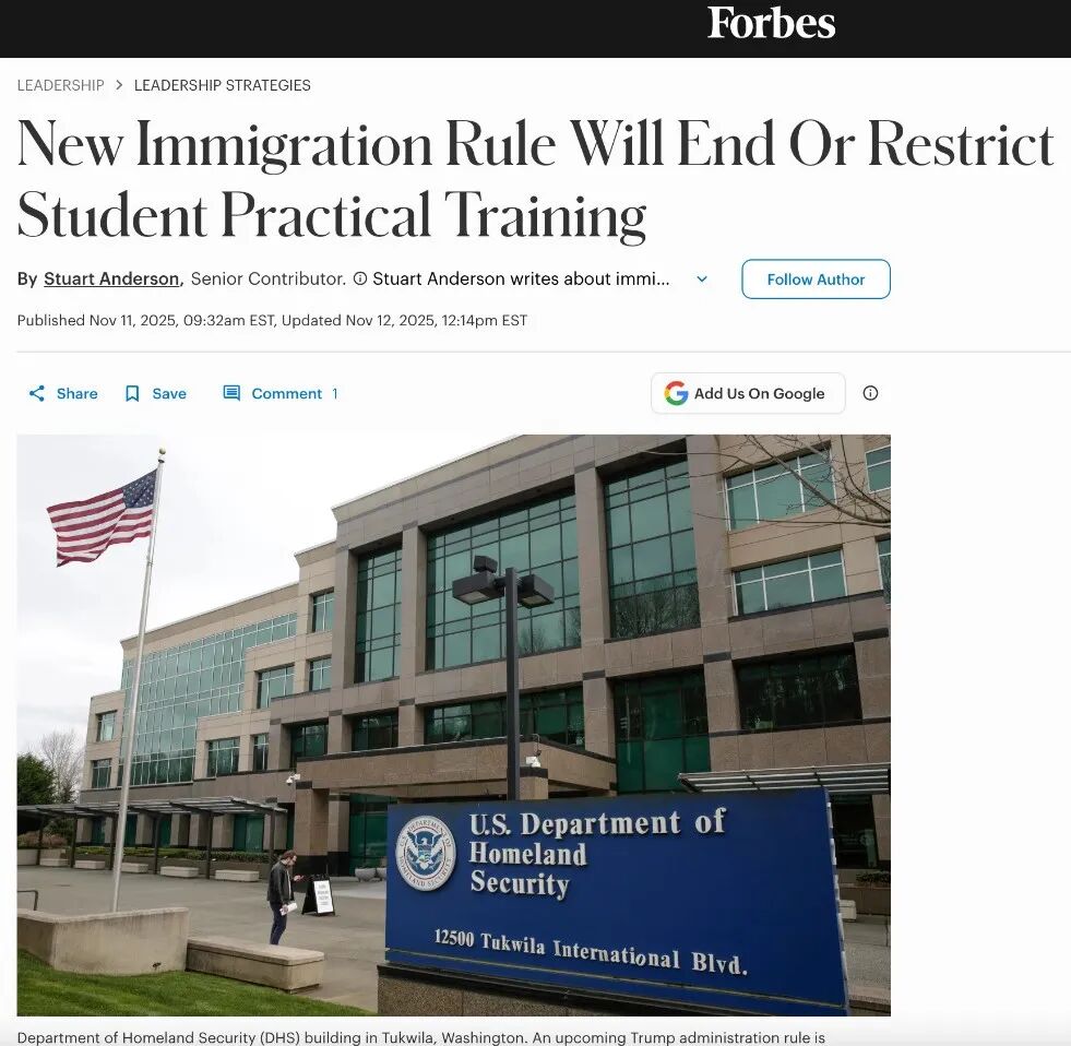据福布斯报道,美国国土安全部(DHS)预计将在今年年底或2026上半年,出台一项规则来终止或限制国际学生的选择性实习培训(OPT)项目。这项改革规则目前已被列入公共监管议程,最快年底前、最晚2026年上半年就将落地,改革走向只有两个:要么彻底取消,要么加严限制。