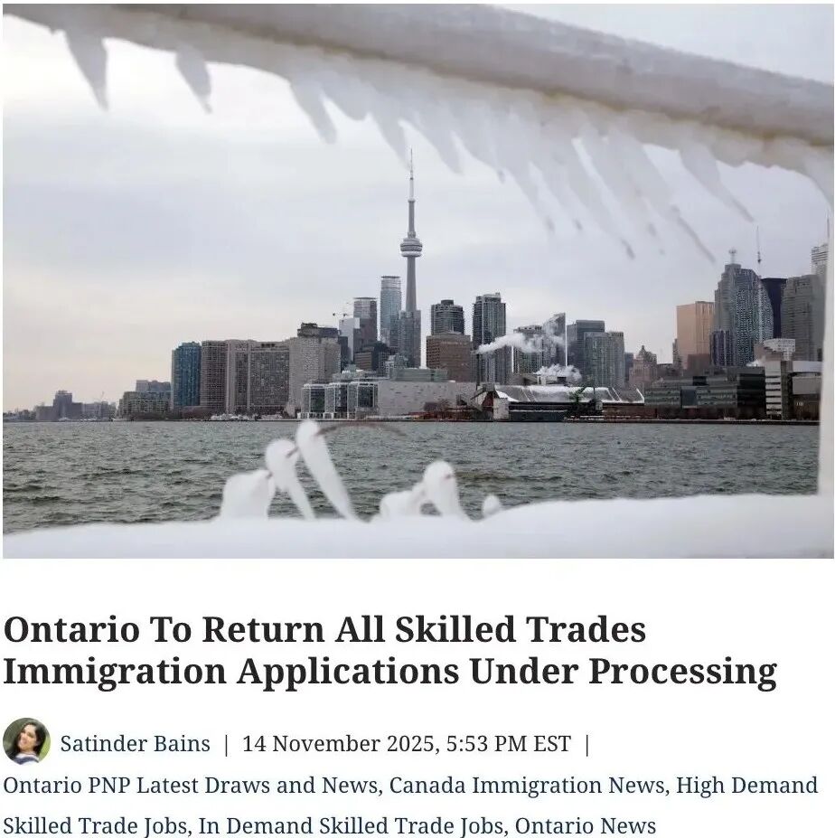 11月14日,安大略省提名移民计划(OINP)发布重磅更新——所有通过快速通道技术工人类别(Skilled Trades Stream)提交的在审申请,将被全部退回,并全额退款。