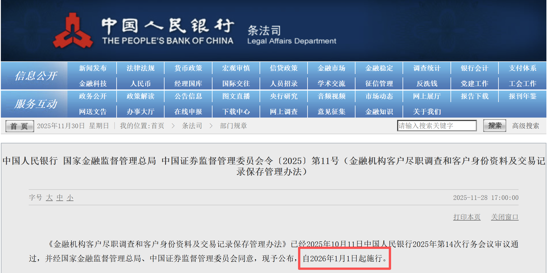 11月28日,人民银行官网发布《金融机构客户尽职调查和客户身份资料及交易记录保存管理办法》规定:“单笔人民币5000元或外币等值1000美元以上的境外汇款需核实汇款人身份”,从2026年1月1日起施行。