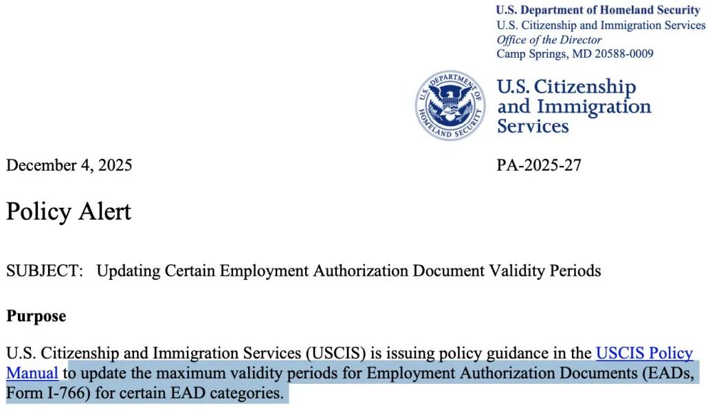 2025年12月4日,美国移民局(USCIS)发布最新政策公告,自2025年12月5日起,多类工作许可(Employment Authorization Document,简称EAD)有效期将从原先最长5年直接缩短至18个月。此次调整适用于首次申请和续签,立即生效,覆盖当天及之后提交的所有I-765申请,也包括正在等待审批的案件。