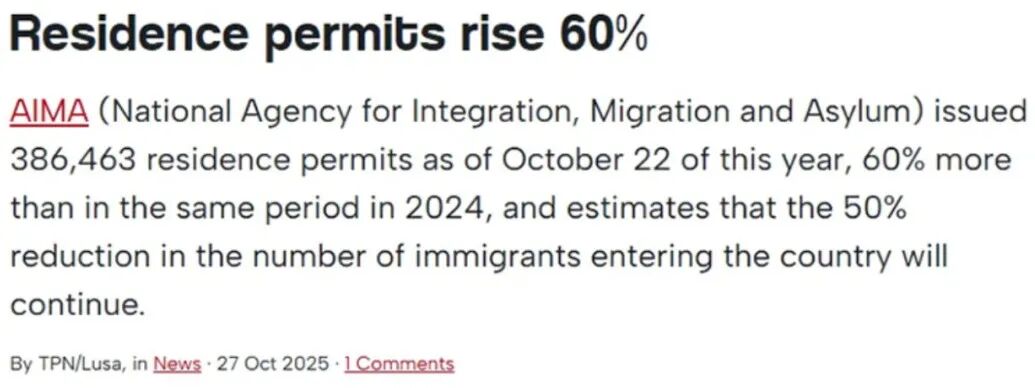 据葡萄牙移民局(AIMA)公布的数据,截至2025年10月22日,葡萄牙已发放386,463份居留许可,较2024年同期的236,030份增长超过60%,创下历史最高纪录!