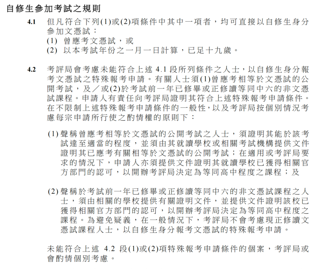 如考生未能符合上述两项条件,可以自修生身份报考文凭试的特殊报考申请。根据最新规则,有关人士须曾应考同等文凭试的公开考试,或并非修读文凭试,但在考试前一年已修毕或正修读考评局认可为等同中六的课程的人士。