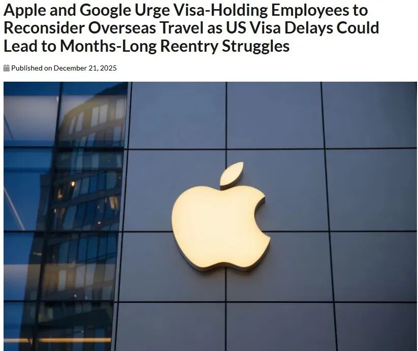 近日,根据《Business Insider》报道,谷歌、苹果、微软以及ServiceNow 等多家美国科技巨头公司,已发邮件明确建议部分持有非移民签证的员工不要离开美国。因为美国非移民签证处理积压日益严重,一旦出境,员工如果签证盖章延误,返回美国可能面临长达数月甚至更长时间。