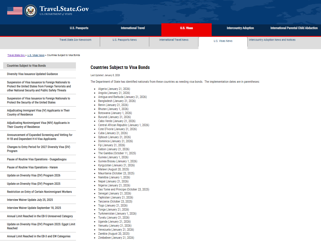 根据通知,新增国家的保证金要求将于1月21日生效。最新列入签证保证金要求名单的25个国家包括阿尔及利亚、安哥拉、安提瓜和巴布达等。此前被列入名单的13个国家包括不丹、博茨瓦纳等。