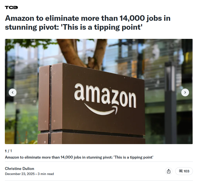 早在2025年10月,Amazon就宣布新一轮约3万人的组织重组计划。到去年年底,已确认完成约14,000人裁员。管理层明确表态:组织瘦身仍将持续推进。官方理由直白——减少中间管理层、压缩协调岗位、加速向AI和自动化倾斜。