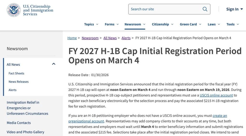 近日,美国公民及移民服务局(USCIS)正式公布2027财年新一轮抽签类H-1B网上电子注册窗口详情,标志着本年度H-1B申请大战正式拉开序幕!