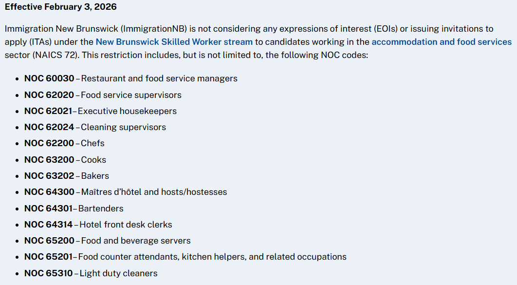 凡是雇主本身属于住宿与餐饮行业(NAICS 72)的岗位,即便你已经在NB省工作,也不再被受理EOI,更不会发邀请。受影响岗位包括但不限于: