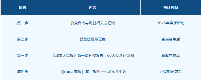 根据加拿大联邦法规制定的常规流程,一项监管修正案从规划到生效通常需经历以下阶段: