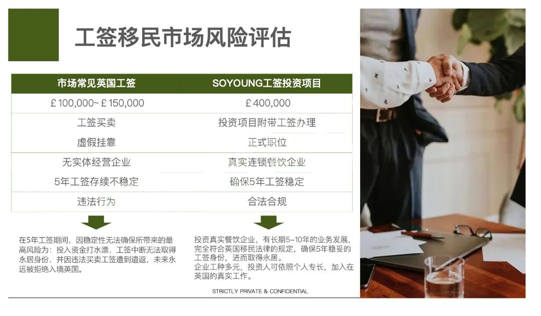 · 投资人作为股东,入股40万英镑至投资人公司,投资人公司统一借款至SOYOUNG品牌总司,SOYOUNG品牌总公司出具合法可信的抵押与借款协议保障,并为投资人办理5年期英国移民签证。