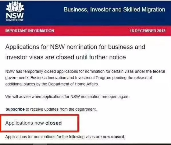 12月18日下午,澳洲新南威尔士州政府通知,暂停所有商业移民申请;包括188A创业投资类,188B投资类,188C重大投资者类,和132天才企业家类移民签证州担保申请,政府会进一步通知何时将再次开放申请。维多利亚州,昆士兰州,南澳州,西澳州,塔斯马尼亚州可以继续申请,最新消息,洲际海外会再持续更新。