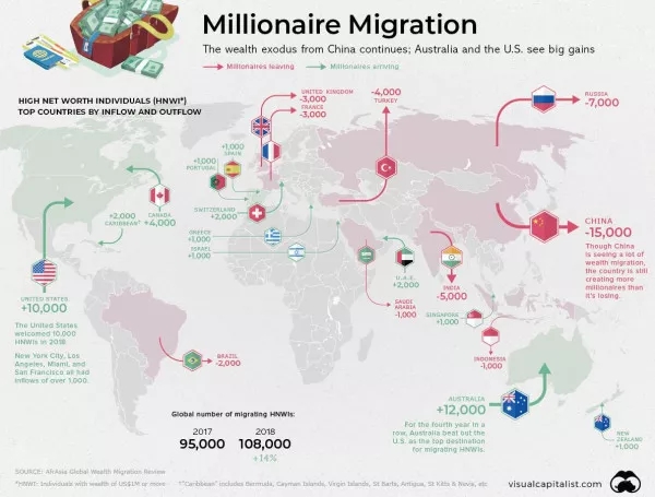 在过去的二十年里, 中国一直是一个创造财富的机器, 富人越来越多。尽管中国仍在使众多国内民众变的富有, 但仍有超过 15, 000名中国百万富翁选择在2018年移民到其他国家。