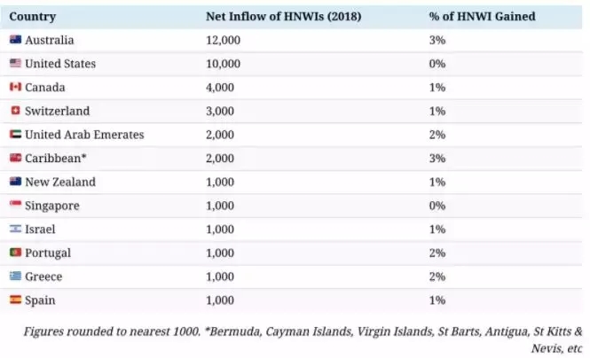 在这份“移民图谱”中,可以看到的是,除了1.2万余名高净值人士选择移居澳洲以外,美国(1万+)、加拿大(4000+)、西班牙(1000+)、希腊(1000+)、葡萄牙(1000+)等国家也是富人眼中的“香饽饽”。