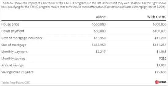 如果以一间$400,000的新房为例,可以看到有了CMHC的补贴之后,买房者每个月可以节省$252加元,每年可以节省$3024加元,25年的贷款时间下来总共可以节省$75600!