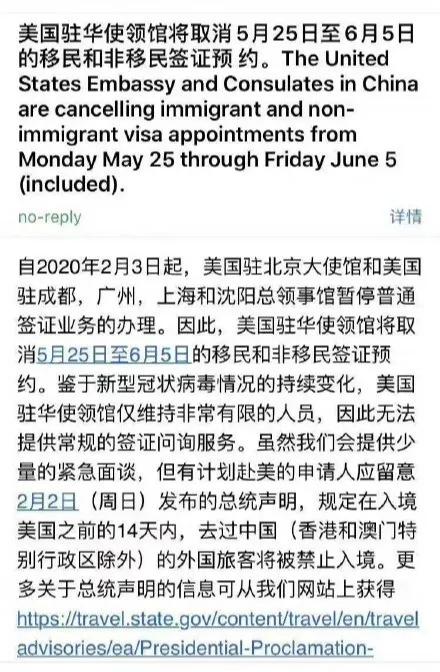之前公布的信息是,面签预约取消持续到5月22日;而如今,根据美国驻华使领馆发送的最新邮件通知显示:其将取消5月最后一周和6月******周的移民和非移民签证预约。其邮件中表示,“鉴于新型冠状病毒情况的持续变化,美国驻华使领馆仅维持非常有限的人员,因此无法提供常规的签证问询服务。”