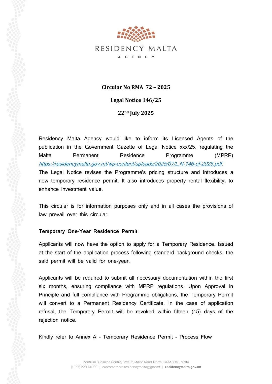 2025年2月3日,马耳他身份局发布官方通告,宣布为其持牌代理提供了一项新功能,代理人可以通过在线门户网站提交新的MPRP申请,线上递交申请门户正式启用。